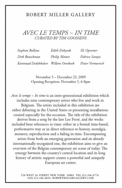 Le titre de l’exposition est tiré d’une chanson du regretté Léo Ferré et les œuvres présentées font référence au temps : soit de manière formelle, soit de manière performative, soit en référence directe à l’histoire, à la nostalgie, à la mémoire, à la reproduction et à l’évanouissement du temps. L’exposition, qui réunit des artistes de la nouvelle génération et des artistes de renommée internationale, vise à donner un aperçu de la scène artistique contemporaine belge d’aujourd’hui. Cette scène florissante tire parti de la situation centrale du pays et de sa longue histoire de soutien artistique pour créer un centre d’art productif.